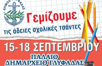 Η συγκέντρωση των σχολικών ειδών (τσάντες, σπιράλ τετράδια, κόλες Α4, μολύβια, στυλό, κασετίνες κ.λ.π.) θα πραγματοποιηθεί στις 15, 16, 17 και 18 Σεπτεμβρίου στο Παλαιό Δημαρχείο Γλυφάδας (Ποσειδώνος & Σάκη Καράγιωργα) από τις 10 π.μ. – 1μ.μ. και από τις 6 μ.μ. – 9 μ.μ.